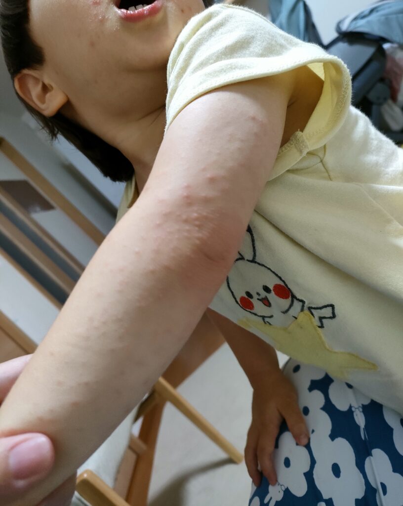 にも発疹が広がり、さらにその後、腕や足全体にブワッと赤いブツブツが出てきました。