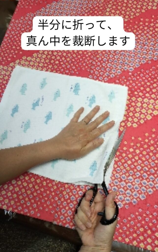 タオルを半分に折り、真ん中を裁断します。