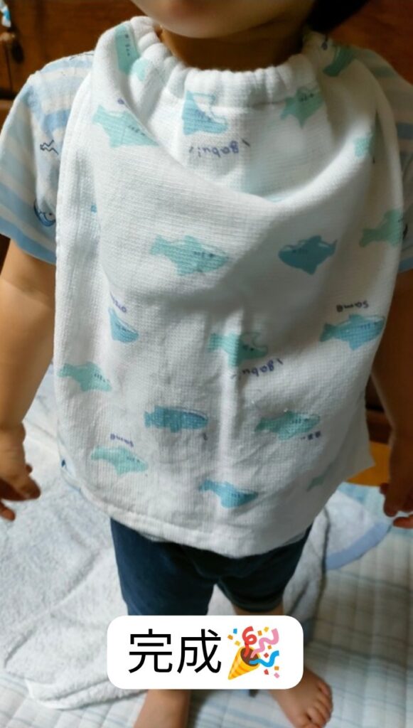 保育園で使うゴム付きタオルエプロンは、ちょっとした工夫で簡単に手作りできます。
